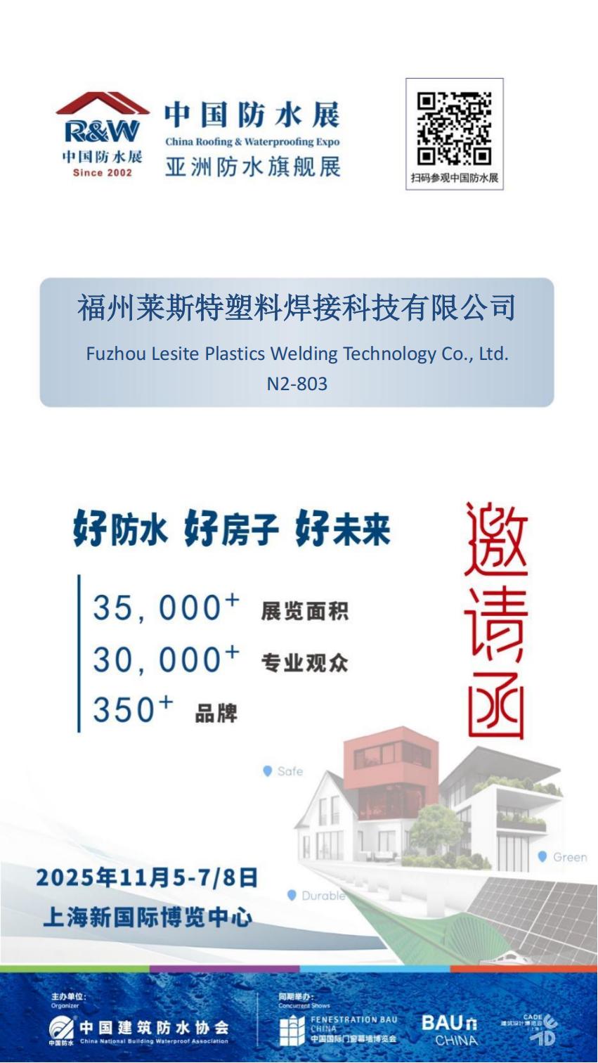 于萊斯特而言,此次參展不僅是技術(shù)與產(chǎn)品的亮相,更是對(duì)品質(zhì)的堅(jiān)守、對(duì)責(zé)任的擔(dān)當(dāng)。2025 年 11 月 5-7 日,讓我們相約黃浦江畔,于上海新國(guó)際博覽中心 N2 館 803 展位相聚!在這里,您可輕觸防水科技的最新脈搏,感受行業(yè)智慧的匯聚之力;在這里,我們將攜手探索建筑防護(hù)的無(wú)限可能,以匠心與創(chuàng)新,共同書寫防水行業(yè)的嶄新篇章。