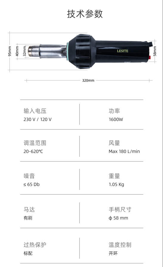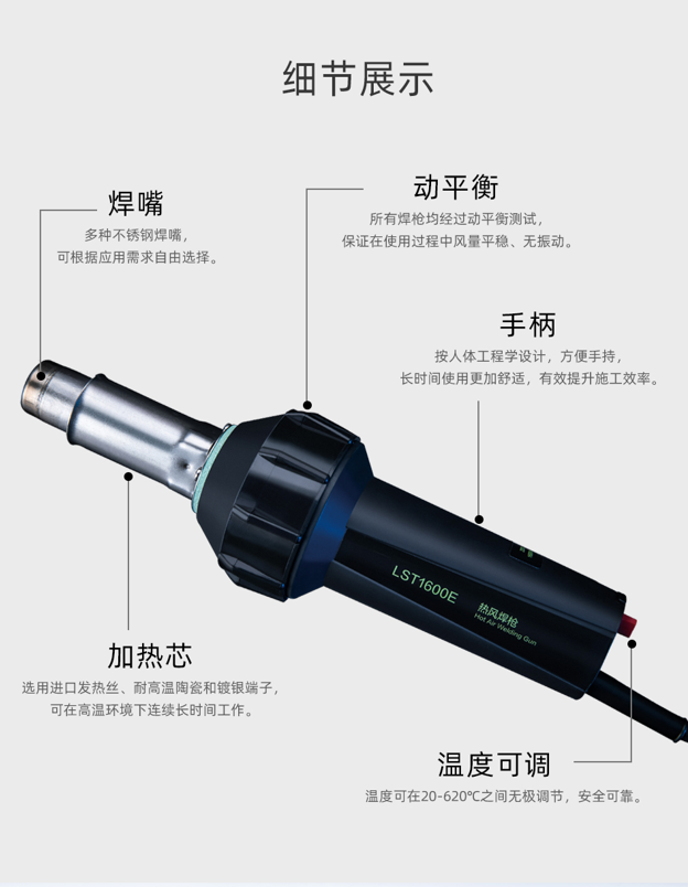 LST1600E是一款便攜、經(jīng)濟實用的手動工具,電子溫控連續(xù)可調(diào),溫度控制精度高,性能可靠,結構緊湊,使用壽命長。長時間高溫連續(xù)穩(wěn)定可靠運行,具有體積小,重量輕,使用方便等特點。換裝不同噴嘴可以滿足不同的焊接需求,除進行焊接外,還可對塑料進行熱成型、對接等作業(yè),配合自動焊接機、擠出式塑料焊槍使用。